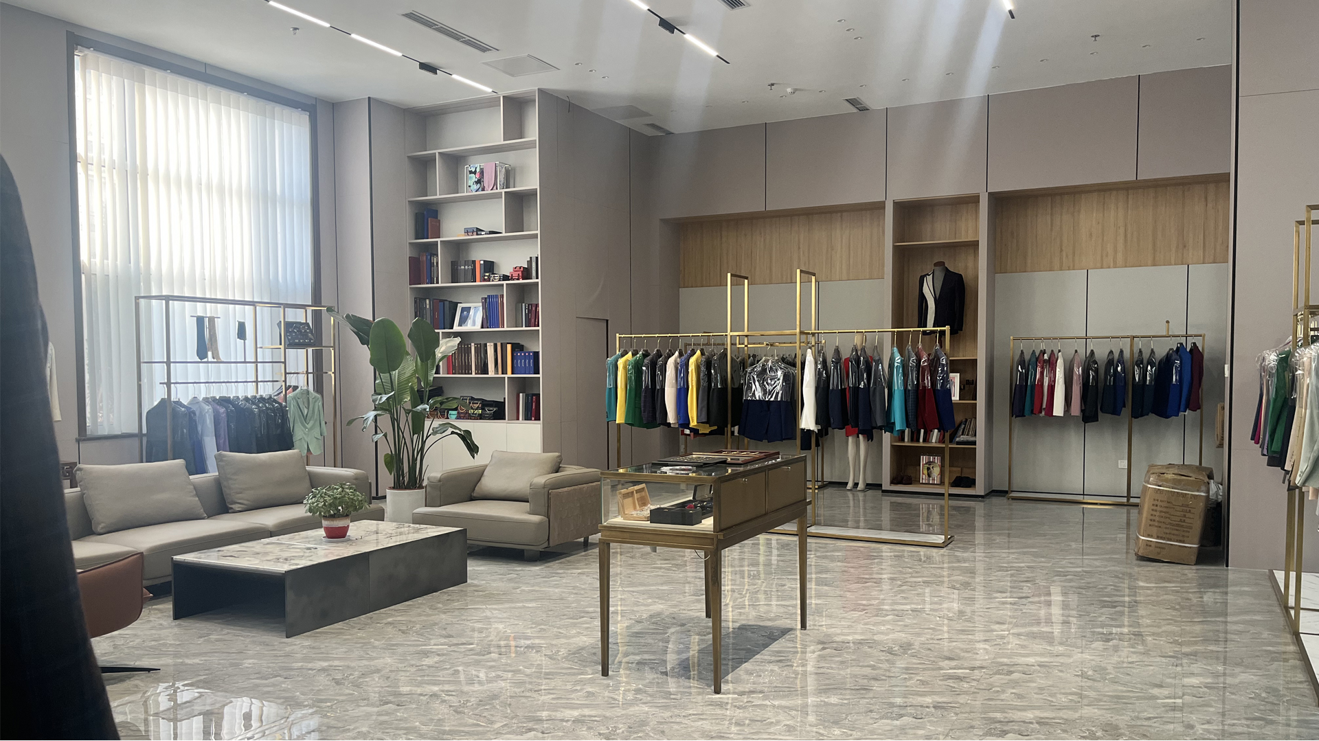 開放式工廠 行政辦公樓 形象展示店 展廳一角 樣衣展示 自動化裁剪 車間精細(xì)生產(chǎn) 流水線成品庫